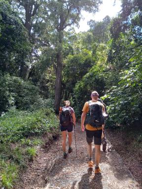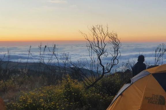 Le sentier traverse d’abord des terres agricoles et une forêt de pins avant de pénétrer dans la forêt tropicale. Sur ce versant plus sec et reculé de la montagne, la végétation s’éclaircit rapidement, laissant place à la lande. Après environ 4 heures de marche, nous atteignons le camp Simba, situé à 2625 m d’altitude, près de grottes, à la lisière de la forêt et de la zone de bruyères.