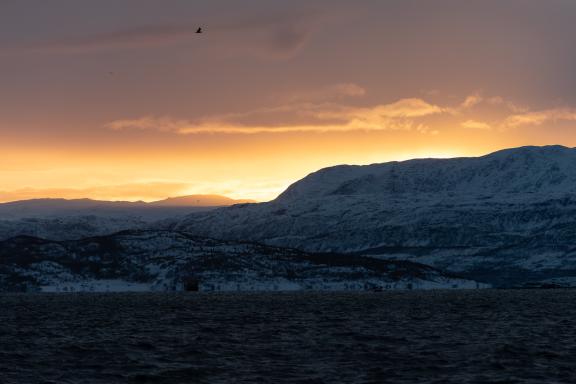 De fin octobre à fin janvier, les Orques et baleines se nourrissent de manière frénétique nous offrant un fabuleux spectacle sous les lumières du nord à la veille de la nuit polaire et les aurores boréales.