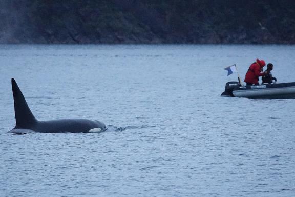 Si nous observons une situation de mise à l'eau possible (par exemple si les Orques se sont rassemblées pour un "feeding" de harengs juste sous la surface), nous embarquons rapidement sur le zodiac pour rejoindre la zone. Le zodiac s'arrête toujours à distance et c'est à nous de faire à la palme les derniers mètres pour "la rencontre"!