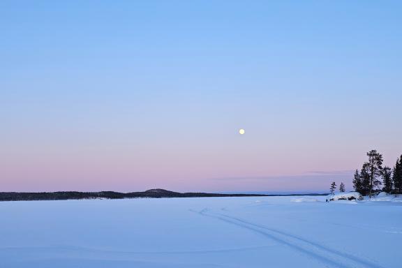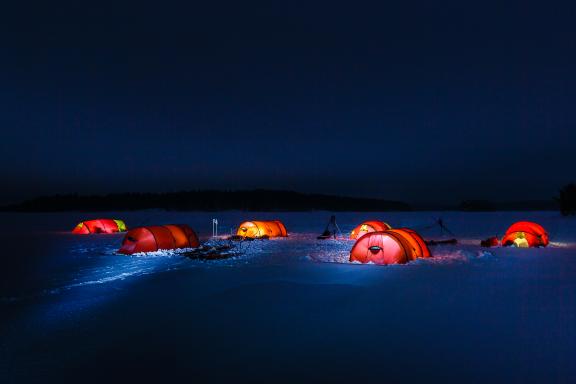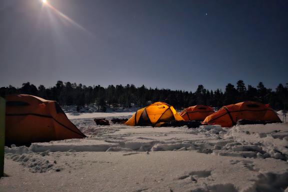 Accompagnés par un guide polaire expérimenté francophone, nous partons pour une itinérance hors des circuits touristiques traditionnels en ski pulka, à six participants au maximum, sur le lac Inari. Ce séjour court a été conçu comme une mini expédition en soi, afin d'acquérir les bases de l'autonomie dans l'environnement polaire, nous préparant à nos futures expéditions plus engagées. Après avoir préparé nos pulkas et avoir été briefés par notre guide, nous démarrons notre raid pour une aventure humaine qui demande un réel esprit d'équipe. Le froid peut être intense en mars. Nous nous adaptons à la météo et aux températures du moment, à l’état de la neige et de la glace, à notre état de forme. Nous bénéficions d’instants magiques de silence et de pureté sur le lac. Nous dormons en bivouac sous les aurores boréales. Une bonne condition physique est le minimum requis.