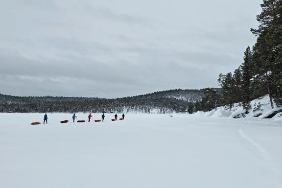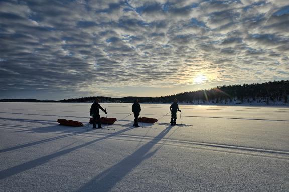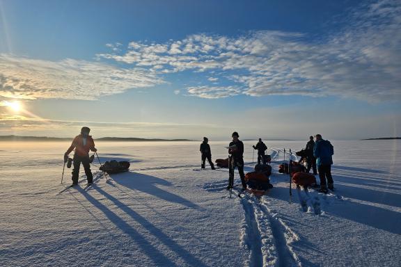 Pour les cinq jours qui viennent, nous allons progresser en totale autonomie dans ce magnifique environnement qu'est le lac Inari. Nous bénéficions d'un routage météo comme dans une expédition plus ambitieuse, pour nous familiariser avec les rituels quotidiens de l'environnement polaire : azimuth, distance et durée de progression, heure de mise en place et défense du bivouac, si nécessaire.