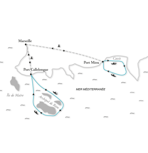 Après le rituel de la prise de météo ensembles (force du vent , état de la mer..), nous embarquons pour une navigation vers les îles du Frioul ou encore les calanques de la côte bleue. Nous quittons rapidement l'effervescence du port autonome de Marseille pour passer devant le tunnel du Rove et rejoindre les premières calanques et leurs eaux turquoises. L'occasion de continuer à progresser en manœuvrabilité de notre embarcation. Le geste se faisant plus efficace, nous pourrons sans doute faire plus de kilomètres que la veille. Notre retour sur la base se fera vers 17H - 18H en fonction des contraintes de chacun.