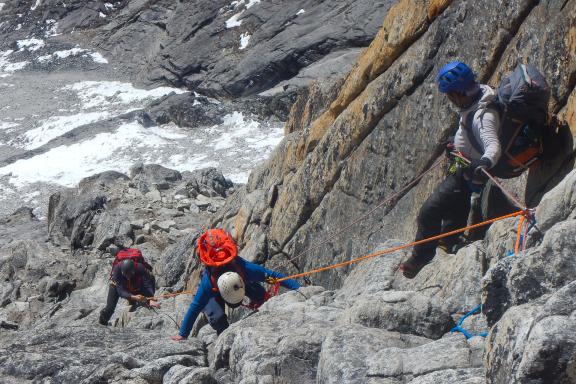 Nos équipes de Sherpas installent des cordes fixes entre le camp 1 et le sommet. L’ascension présente des difficultés rocheuses de Vème degré (entre les camps 1 et 3) et las pentes en neige/glace/roche présentent une inclinaison à 40° à 60°.