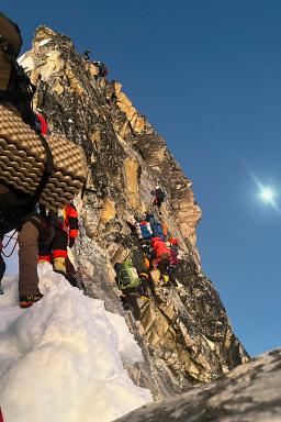 L'escalade se fait sur un rocher généralement bon, avec des passages soutenus entre cotation IV et V, équipés de cordes fixes. C’est un passage clé, aussi exigeant physiquement que mentalement. C'est à cet endroit que quelques bouchons, d'une à plusieurs heures, peuvent se former.