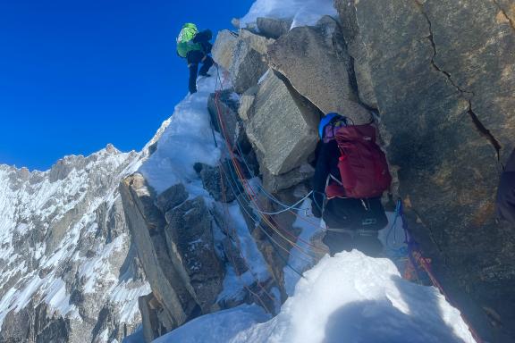 Entre le camp 3 et le sommet de l’Ama Dablam (6 812 m), l’itinéraire remonte une arête de neige et de glace effilée, raide entre 45 et 60° et bien exposée. Peu après le départ, on passe le fameux sérac suspendu de l’Ama Dablam, masse instable emblématique de la voie, qui impose un passage rapide et maîtrisé. La progression s'avère plus aisée que dans les parties inférieures dans les rochers, également entièrement sur cordes fixes, mais elle se fait dans une ambiance aérienne extrême, sujette au vent et aux rafales, où engagement mental et lucidité à haute altitude sont déterminants jusqu’au sommet. Au sommet, vue époustouflante sur l’Everest, le Lhotse, le Cho Oyu et le Makalu. Retour en rappel le long des cordes fixes pour rejoindre le camp 2 voire le camp 1, après un petit stop au camp 3. Nous passons la nuit au camp 2 ou au camp 1 puis rejoignons le lendemain le camp de base.
