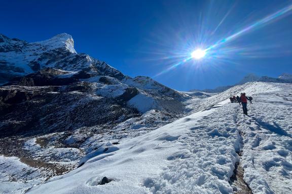 Les deux premières journées sont consacrées à poursuivre l'acclimatation avec une randonnée en direction du glacier du Mingbo La (5800 m) vue panoramique sur toute l’arête sud-ouest de l’Ama Dablam. Nos guides organisent des ateliers techniques sur une paroi verticale située à proximité, afin de travailler la remontée sur cordes fixes bien verticales à l’aide de la poignée jumar et de réviser les techniques de descente en rappel. Ces exercices permettent de s’assurer que l’ensemble des participants maîtrise parfaitement les compétences nécessaires à l’ascension.