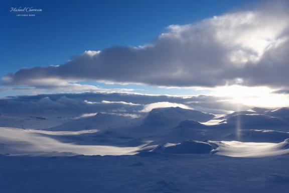 Finse, petite gare ferroviaire située entre Olso et Bergen, est connue pour être la plus haute du pays (1222 m). Ici, pas de route, seule la voie ferrée relie le bourg au reste du monde. La proximité de l'Océan Atlantique Nord , combinée à une altitude et une latitude relativement élevée, assure un excellent enneigement. Au cœur de l'hiver, les conditions climatiques peuvent parfois être rigoureuses et rappellent alors celles des régions arctiques. Plus tard en saison, à l'approche du printemps, le climat, toujours très changeant, offre déjà de longues journées. L'hiver, les lumières rasantes génèrent des ambiances très particulières, étrange mélange de douceur et de rudesse.. Le massif du Skarvheimen et le dôme glaciaire du Hardangerjökulen sont séparés par une longue combe perchée sur laquelle se trouve le hameau de Finse. La position « haute » de ce corridor naturel en fait un lieu à l'aérologie bien particulière.
